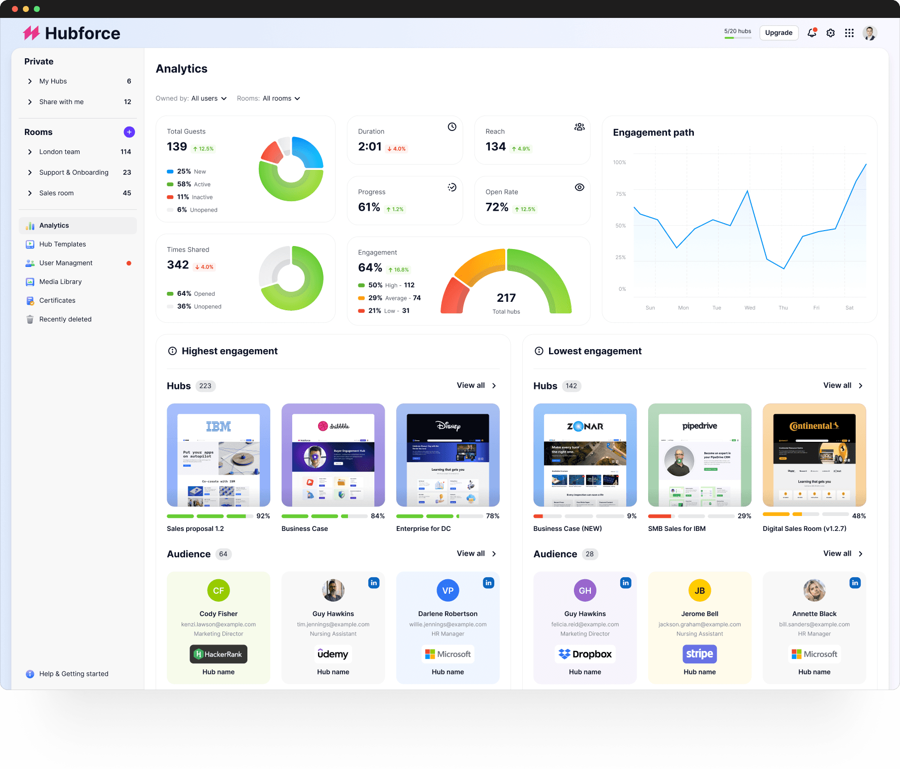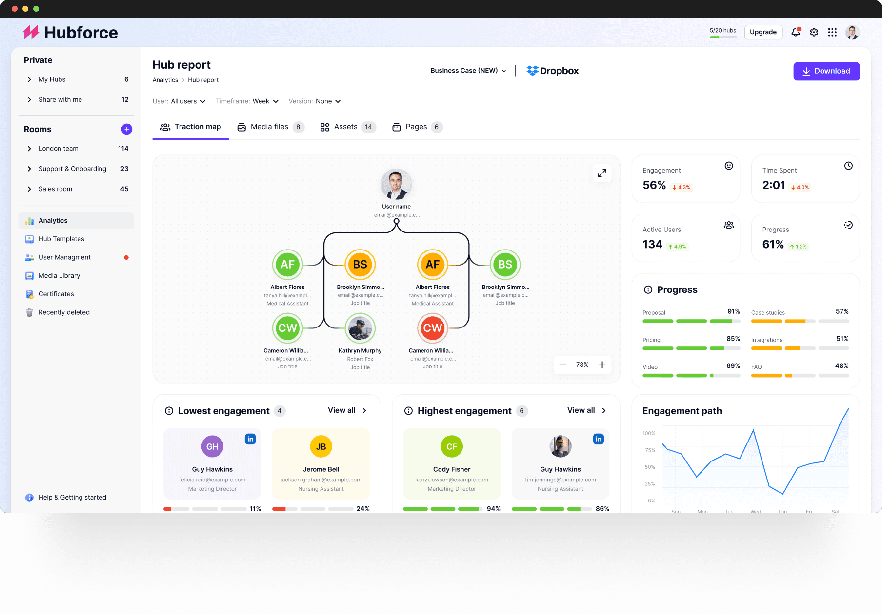 The lower level offers detailed analytics for each hub, comprising a multitude of data points. Most importantly, managers can see the client traction map. This allows them to understand if their commercial proposal has reached the decision-maker and trace the path it took through various employees. This type of data enables managers to better prepare for the next call and schedule it at the right time.