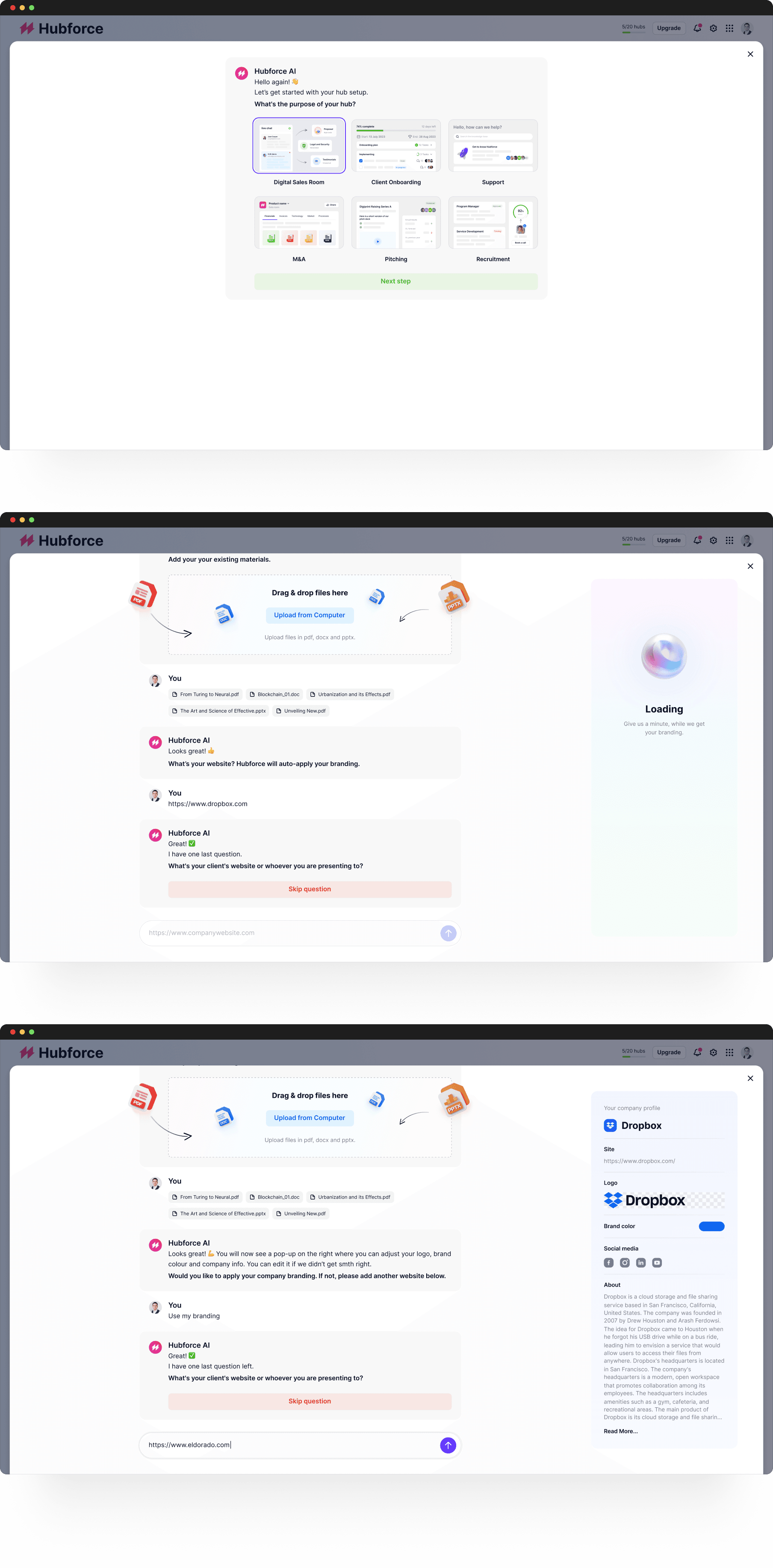 Hubforce enables the instant creation of personalized hubs using artificial intelligence. Content integration and brand alignment are streamlined through AI and user scenarios for website analysis. The initial AI performance with a flexible prompt system did not meet visual expectations, so specialized formulas were developed to optimize this process. A network of dynamic scripts now influences prompt construction and the decision-making of the neural network. Additionally, specialized site parsing scripts were integrated to enhance content integration and ensure brand consistency through AI.