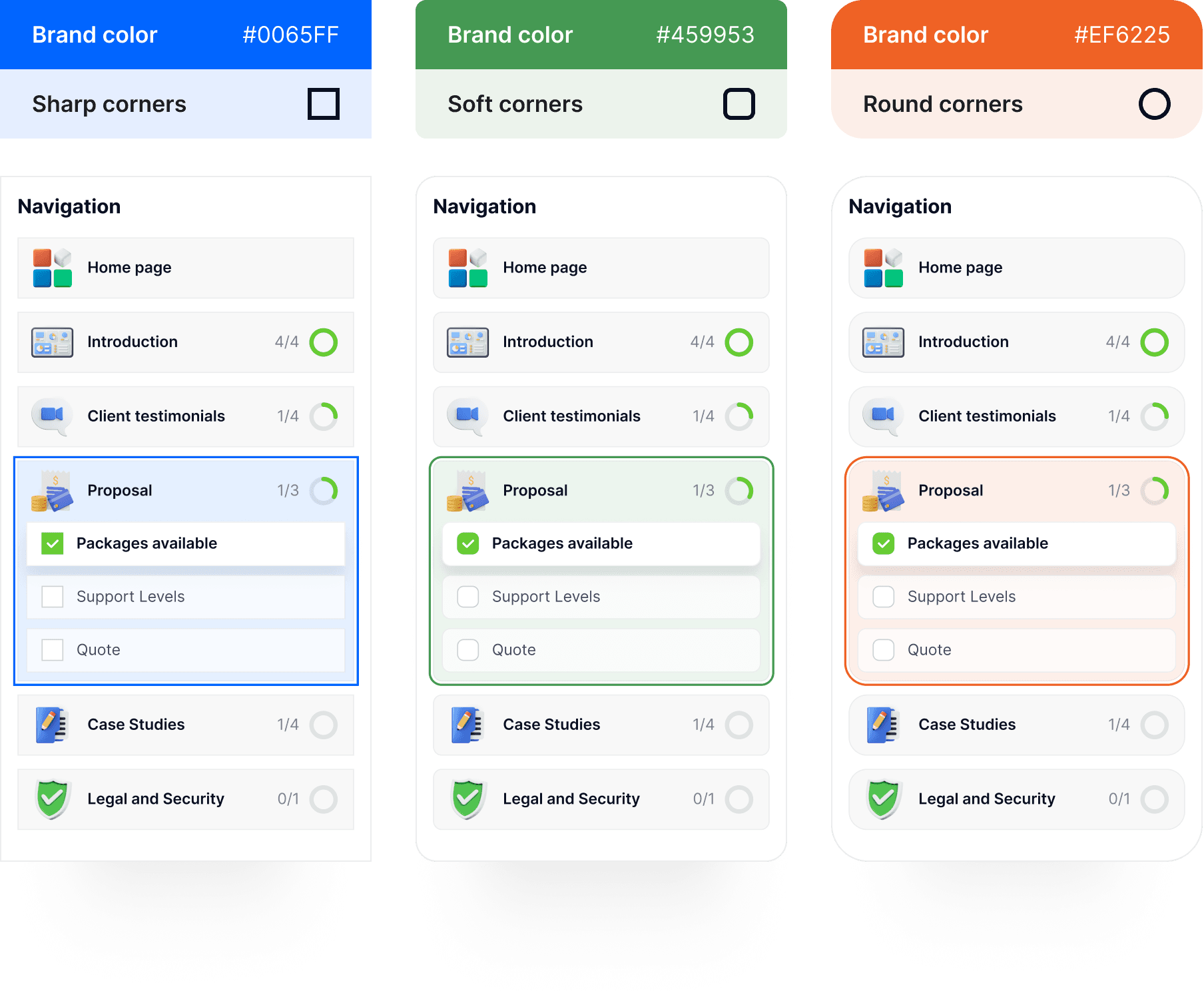 The entire Hubforce interface was developed with the concept of "white labeling" in mind. The navigation menu serves as an example of how "white labeling" principles are applied. Using parsed data, style labeling occurs, encompassing three styles: round, soft, and sharp. Depending on the chosen style, all interface elements adjust their border radii accordingly. The color system operates in a similar fashion, ensuring consistency throughout.