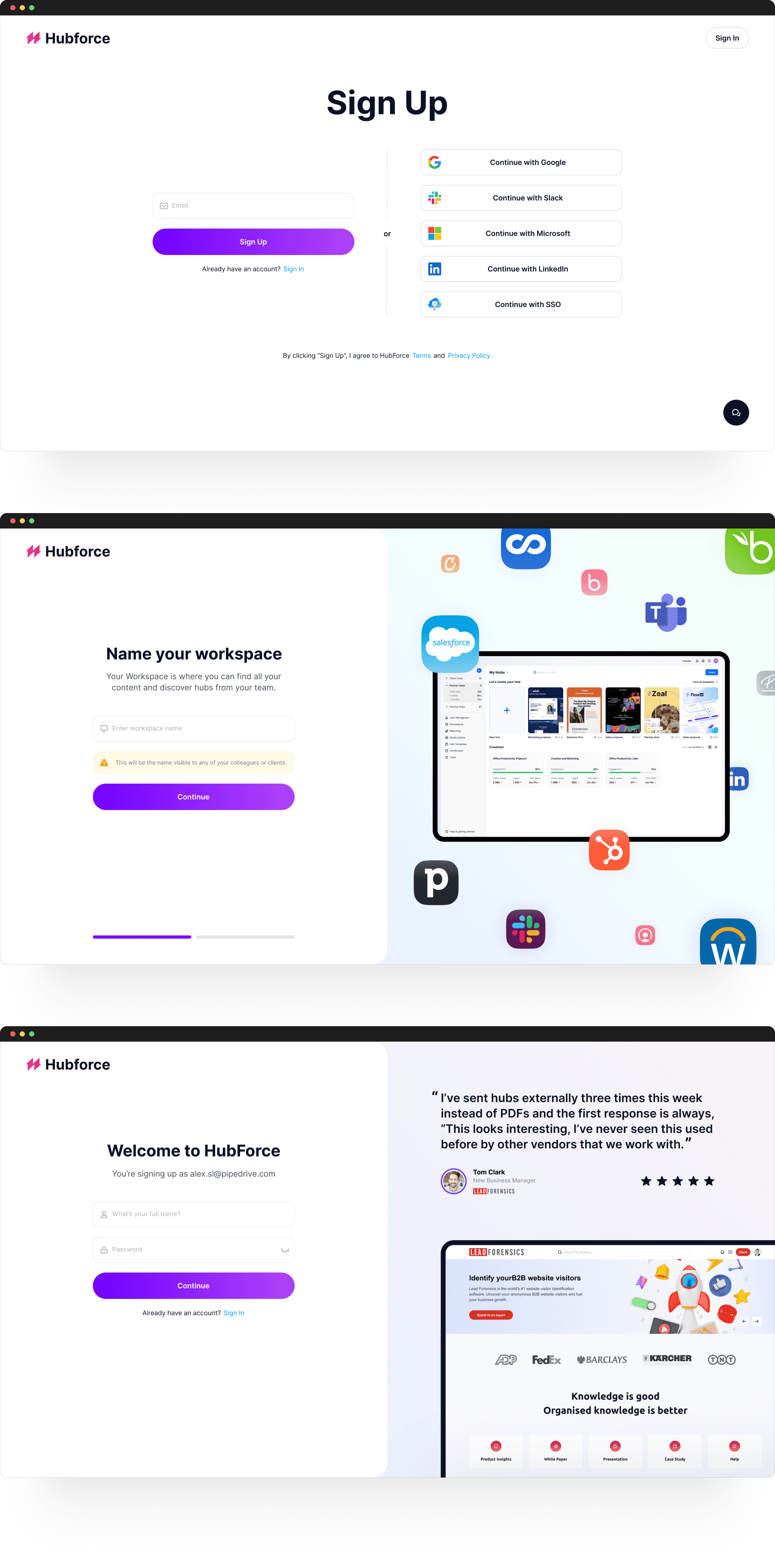 The registration process went through more than 10 iterations, extensively tested with both warm and cold leads. In the final version, we streamlined the number of steps and fields, while integrating bright thematic illustrations. These illustrations not only facilitated the onboarding process by informing users about key integrations but also included an example hub and a genuine client testimonial, significantly enhancing user engagement.