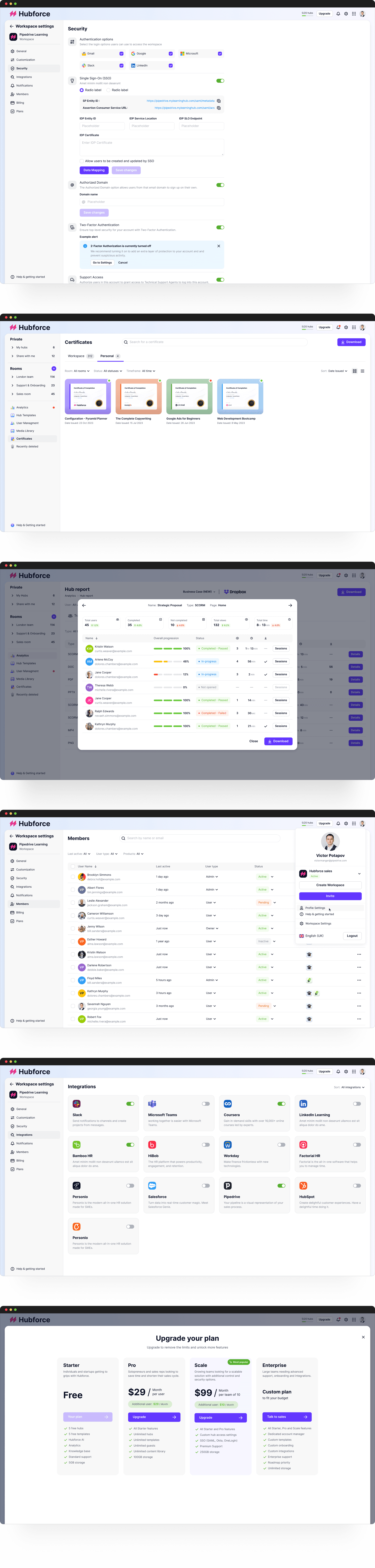 The Hubforce builder features a simple and intuitive design, making it easy to use. However, we didn't reach this point immediately, as the first version had a complex UX. We discovered that potential users were unwilling to spend more than 10 minutes creating a commercial proposal, resulting in incomplete and low-quality hubs. To solve this problem, we implemented simplified navigation on the left side and grouped assets together. Consequently, users can now utilize ready-made templates, only needing to modify the text or occasionally add pre-made asset sets. This approach enables the rapid creation of hub structures, which can be easily customized to fit the company's needs through white labeling.