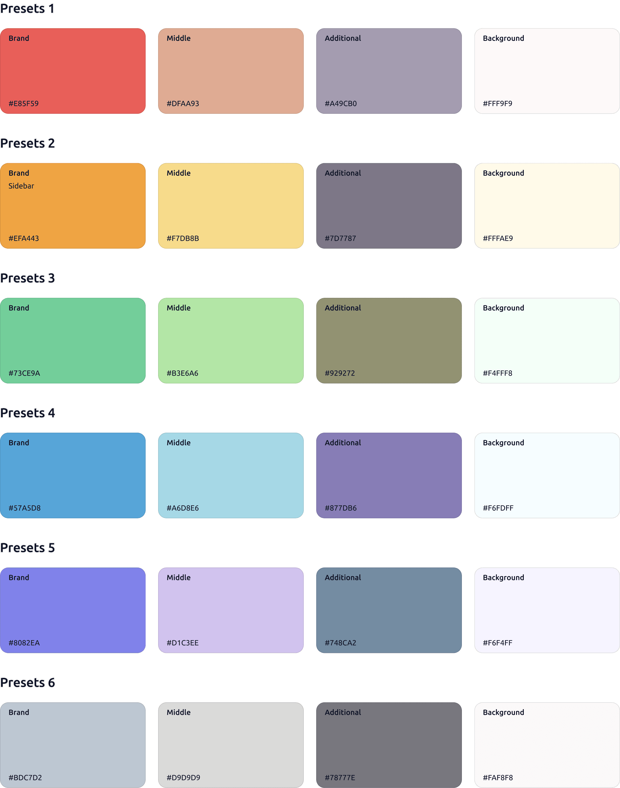 Has 6 preset sets, each consisting of 4 colors, which can be customized according to the brand. Each set includes the brand color, an additional color, a mid-tone color, and a background color. This allows you to customize the illustration to fit your style with just one click, making the customization process quick and convenient.