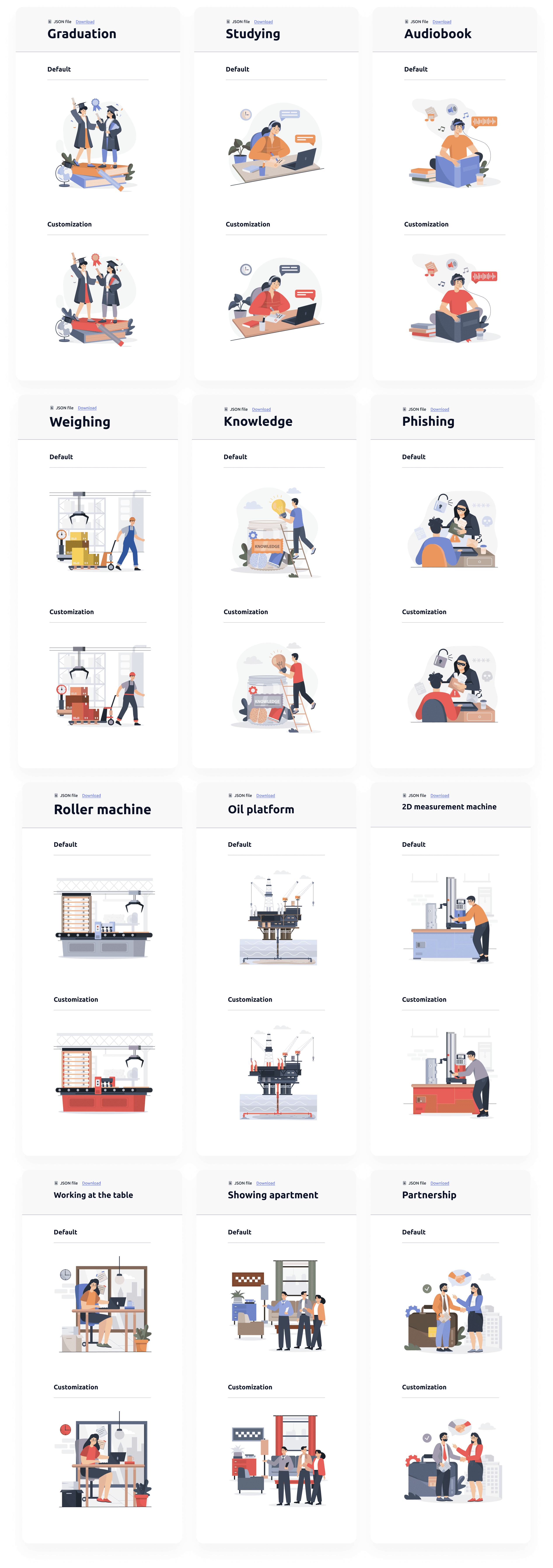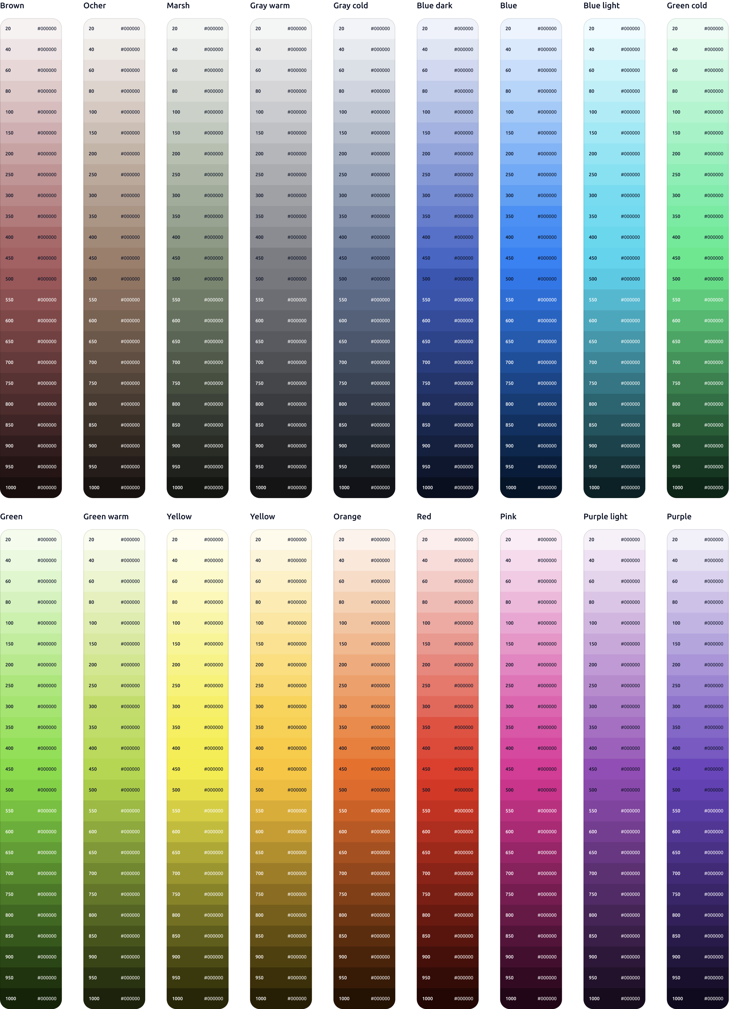 The color palette developed for the default state and illustrations in the JSON library is a key element of a unified style. It includes 18 primary colors, each of which is divided into 23 shades. This has allowed us to achieve a consistent visual experience across all types of monitors, eliminating potential distortions. Thanks to this palette, our illustrations and design elements are visually pleasing and maintain a cohesive style throughout our JSON library.