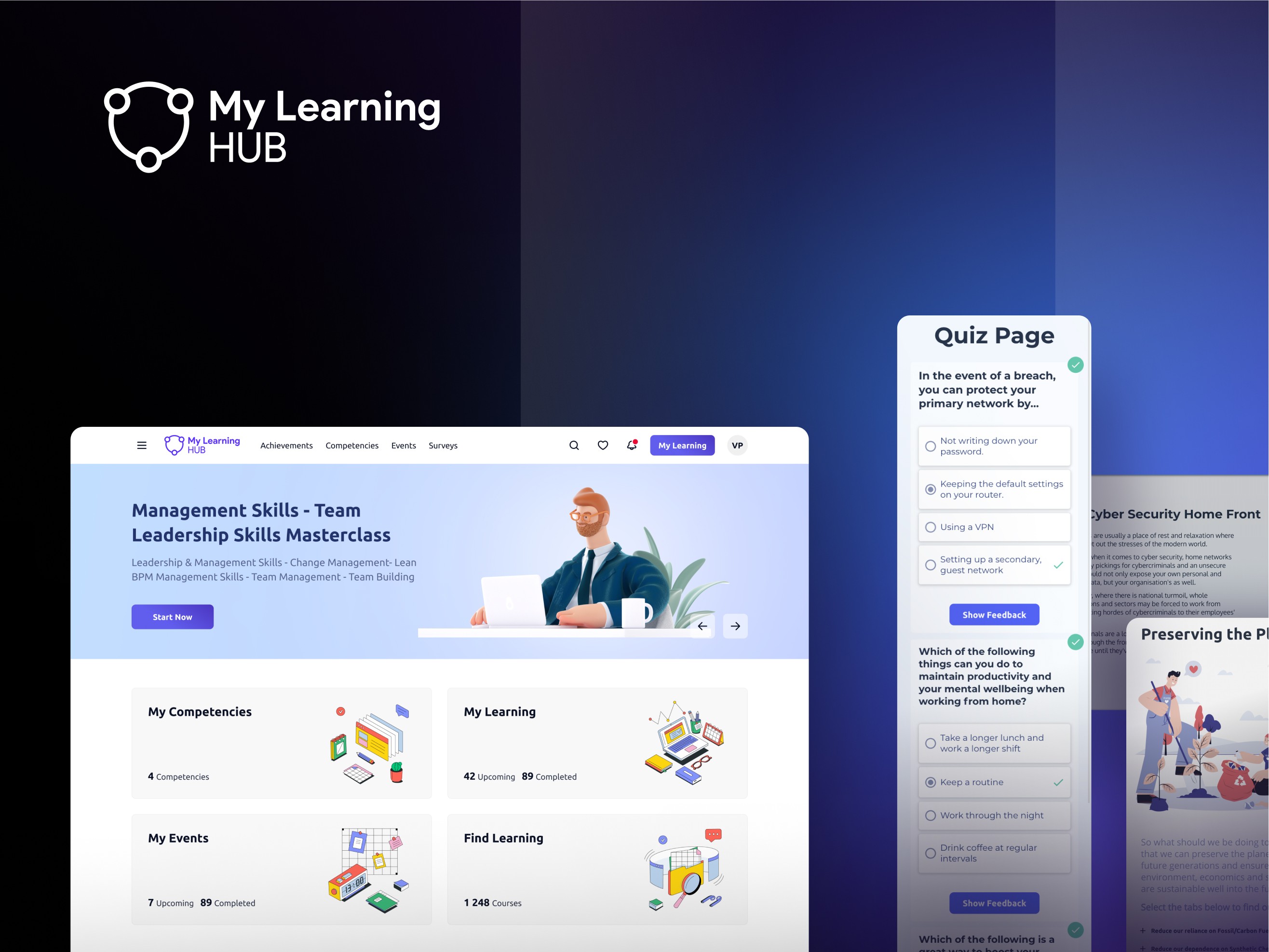 We developed a unique and memorable identity for My Learning Hub that seamlessly integrates with the platform's overall concept and style. We created a logo, color palette, fonts, and other visual elements that reflect the brand's key aspects and values. This consistent style is applied to all elements of the platform, including the interface, content, and marketing materials, to create a unified and recognizable image for My Learning Hub. As a result, users can easily recognize and remember the brand, enhancing its visibility and successful communication with the audience.
