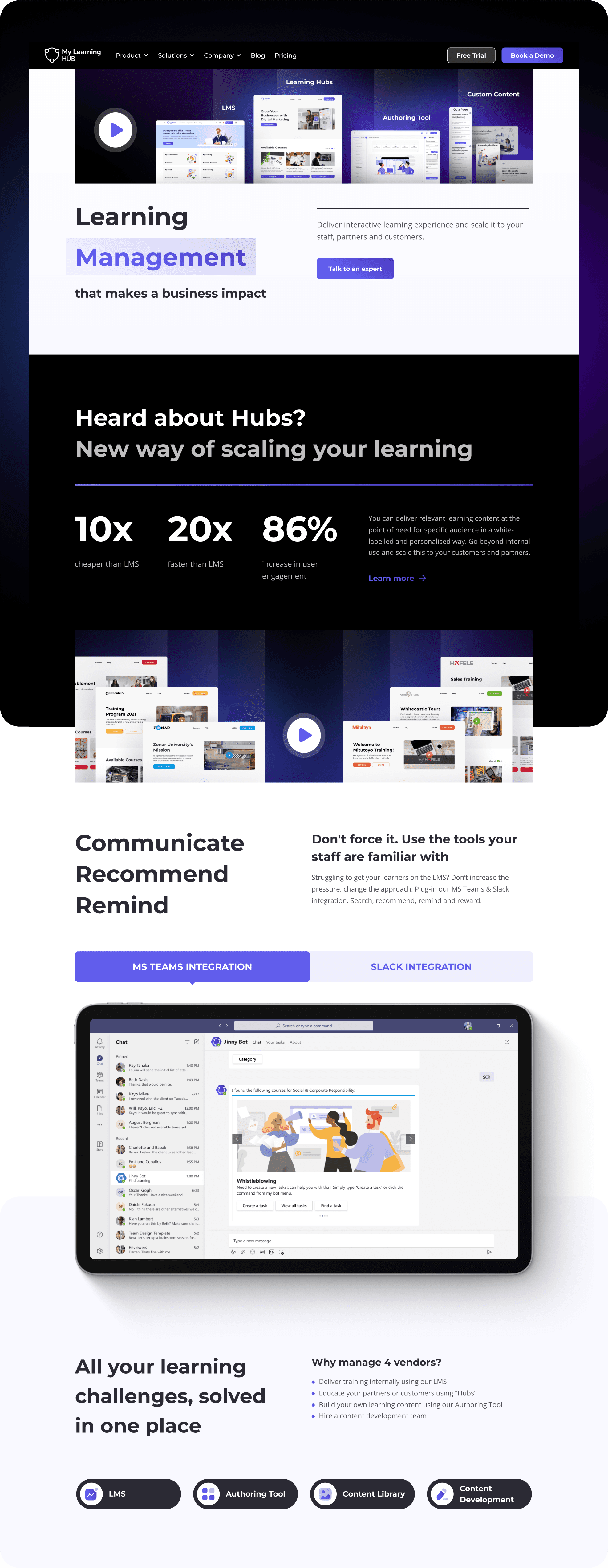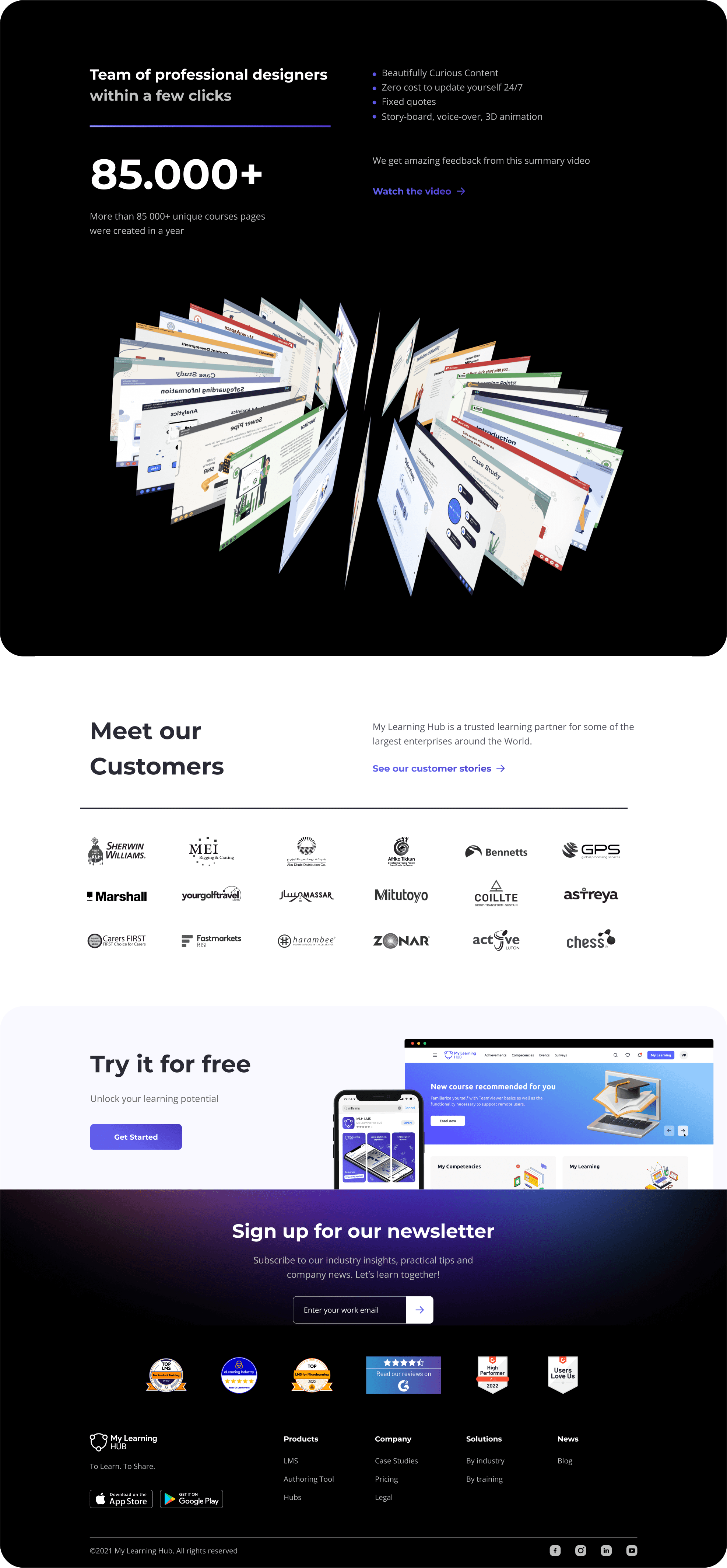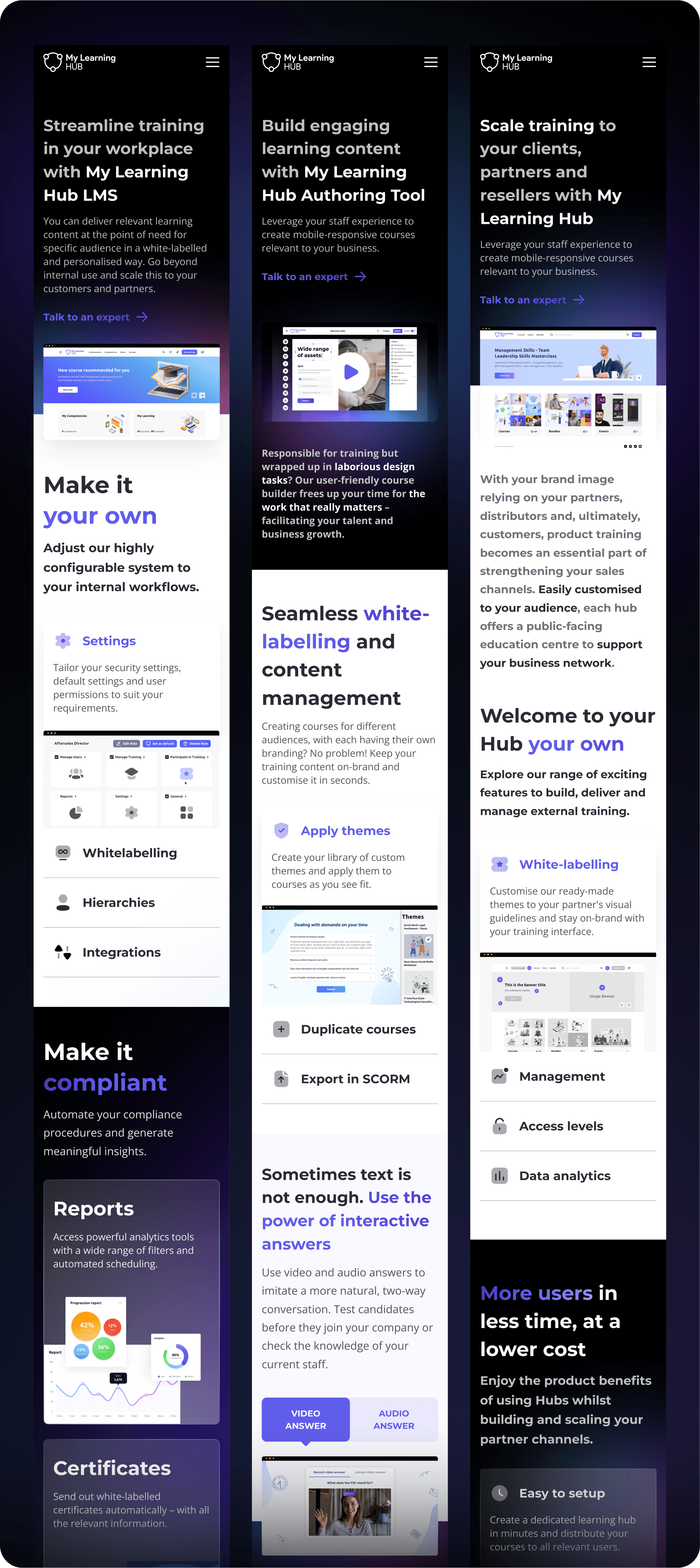 My Learning Hub offers three core products: the Hub, the LMS, and the Authoring Tool. To visualize all these components, over 60 product shots have been created, which are displayed on the product pages. These shots provide a comprehensive overview of the platform's capabilities, enhancing user understanding and engagement. The use of responsive design ensures seamless access to the platform from various devices, optimizing the user experience.